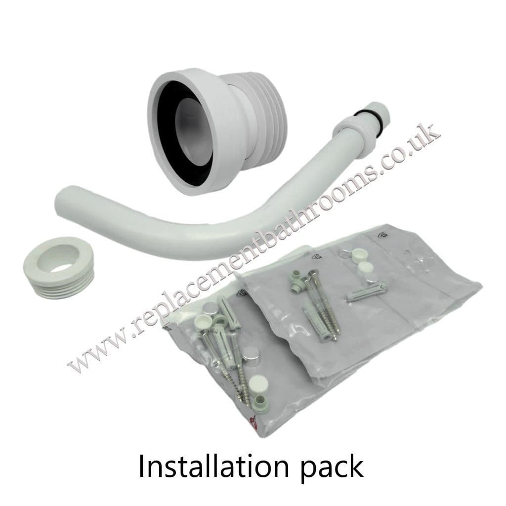 - Supplied with Installation Pack comprising : Four floor fixing screws ( white cover caps), straight pan soil connector, white plastic flush pipe with pan connector and siphon locknut and seal. Pan connector will suit most installations ( but not all ).